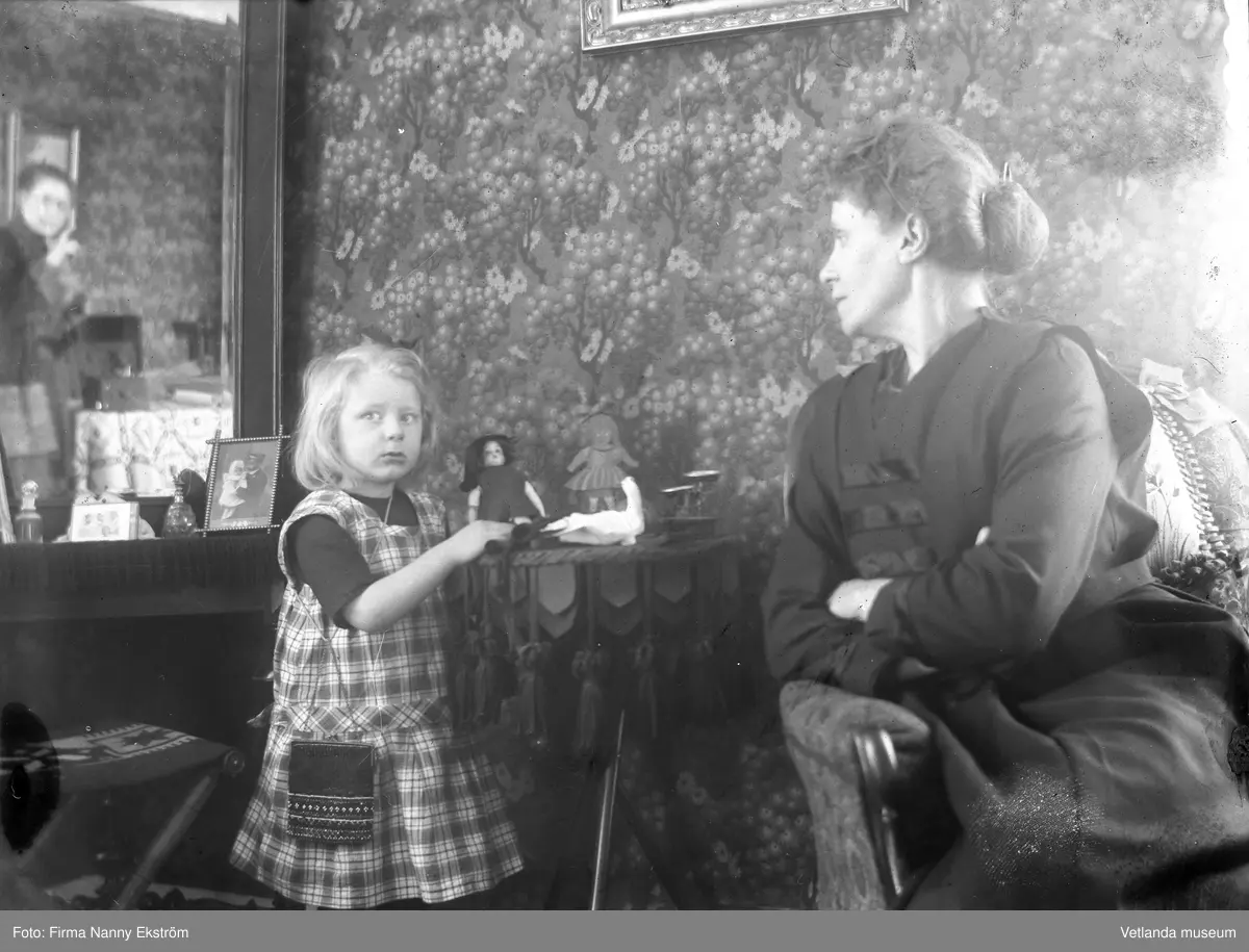 Kvinna med lekande barn. Fotografen Nanny Ekström kan ses i spegeln.