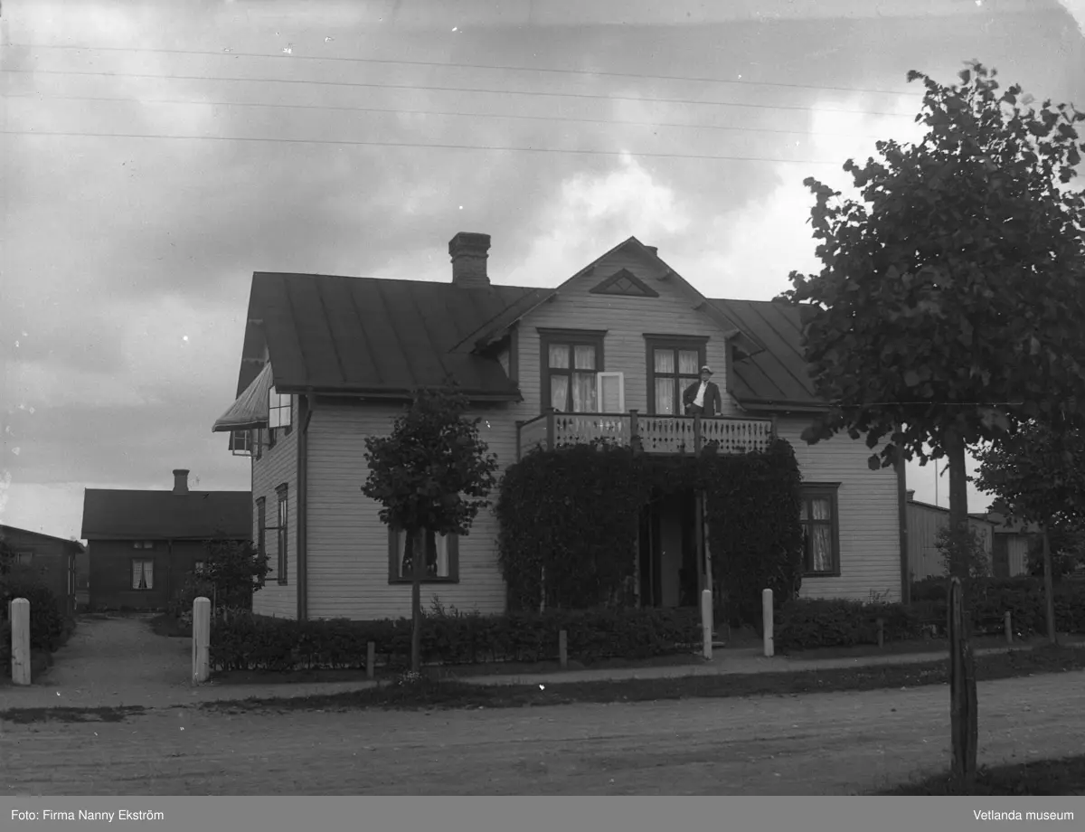 Kyrkogatan 46. Inne på gården fanns två små lägenheter, uthus och smedja/mekanisk verkstad. Mannen på balkongen är oidentifierad.