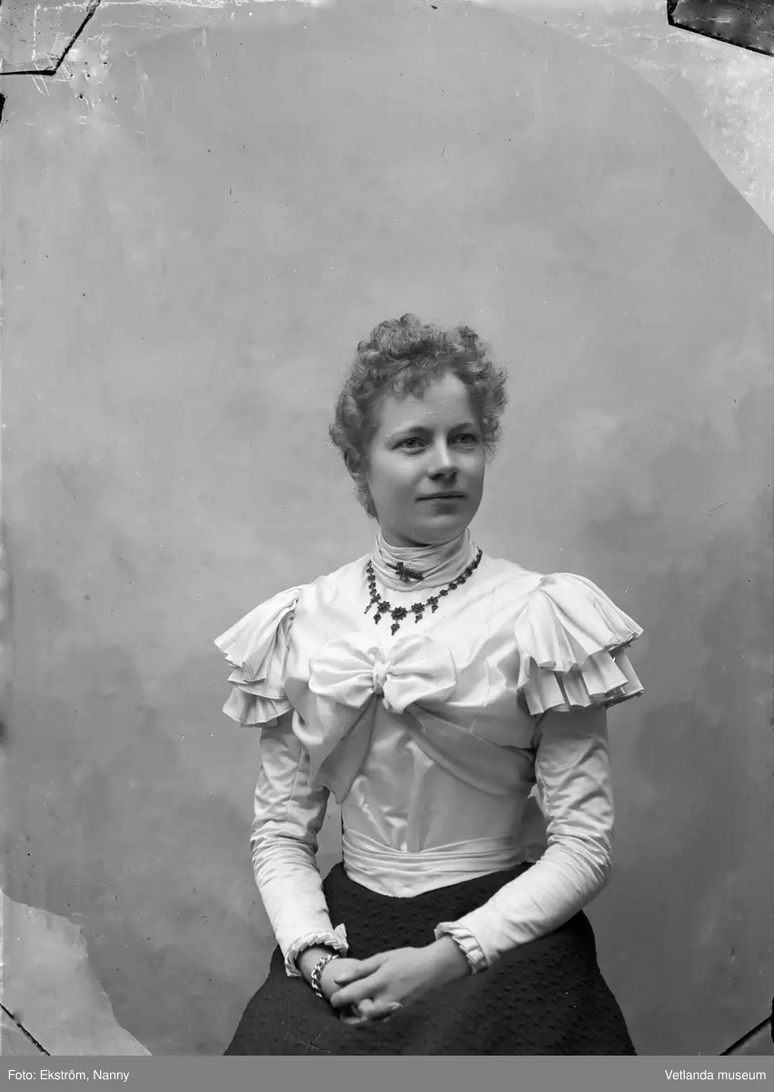 Oidentifierad kvinna fotograferad i Nanny Ekströms ateljé. Kvinnan kan eventuellt vara en av Nanny Ekströms systrar, Mimmi, Amy eller Ida.