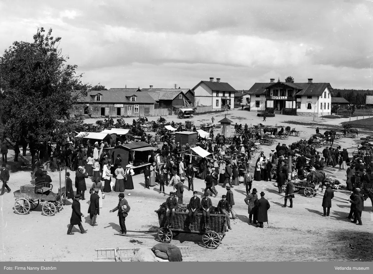 Marknad på Stortorget i Vetlanda, 11 Juni 1902. I bakgrunden syns hotellet och till vänster om det A. Wiklunds fotoateljé.