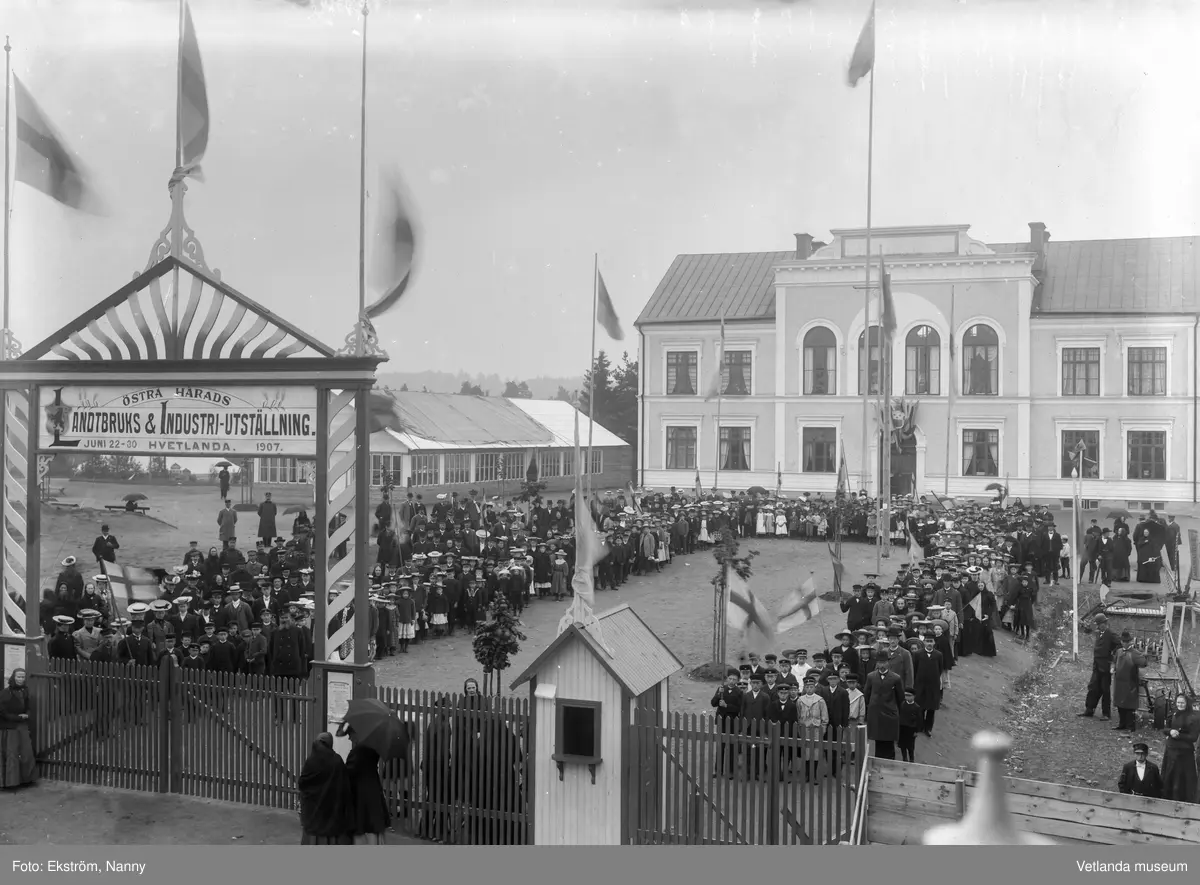 Titel: Skolbarn framför samrealskolan vid Östra härads lantbruks- och industriutställning 1907.