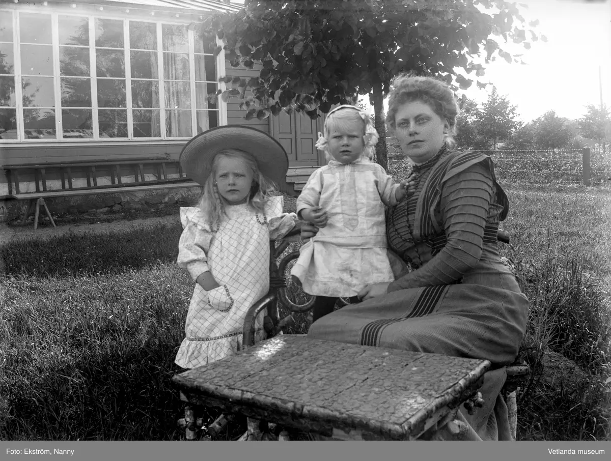 Kvinna med två små barn i trädgården framför fotoateljén på Mogärde i Vetlanda. Kvinnan är troligtvis fotografens syster, Amy Ekström och barnen är troligtvis hennes döttrar, Anna Karin och Inga Kristina.
