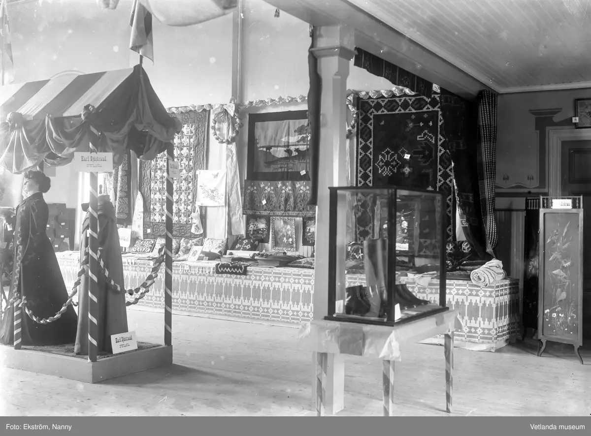Interiör från Östra härads lantbruks- och industriutställning 1907. Till vänster syns kläder från Karl Sjöstrand.