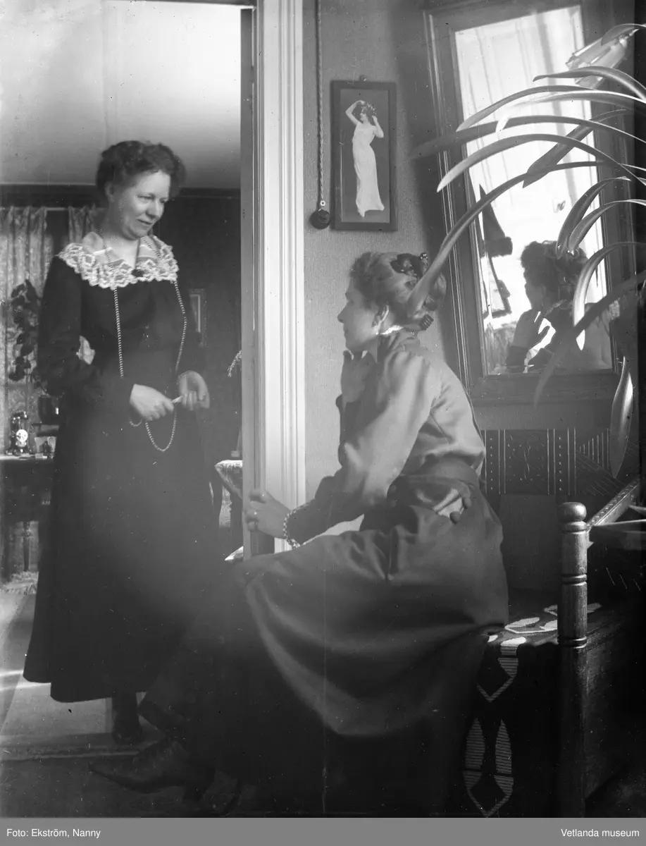 Kvinna i hemmiljö. Troligtvis fotografen Nanny Ekström till vänster och eventuellt en av hennes systrar till höger.
