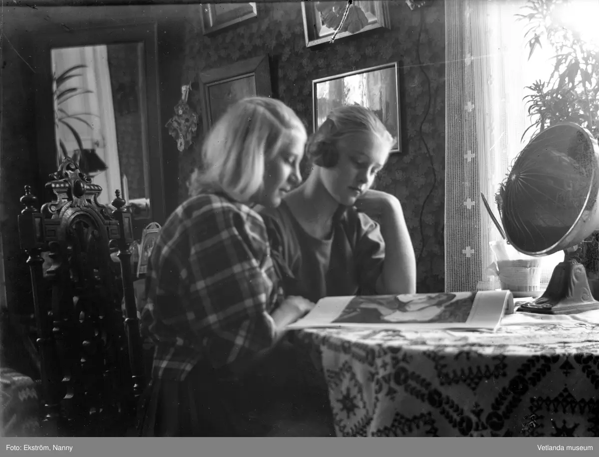 Två flickor vid ett bord. Flickan närmst kameran är Anna Karin Zackrisson. Anna Karin var dotter till fotografen Nannys syster Amy. Bilden är troligtvis tagen i fotografens bostad på Kyrkogatan.