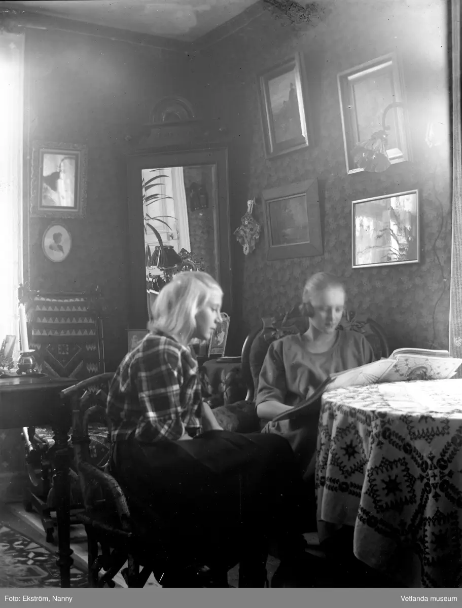 Två flickor vid ett bord. Flickan närmst kameran är Anna Karin Zackrisson. Anna Karin var dotter till fotografen Nannys syster Amy. Bilden är troligtvis tagen i fotografens bostad på Kyrkogatan.