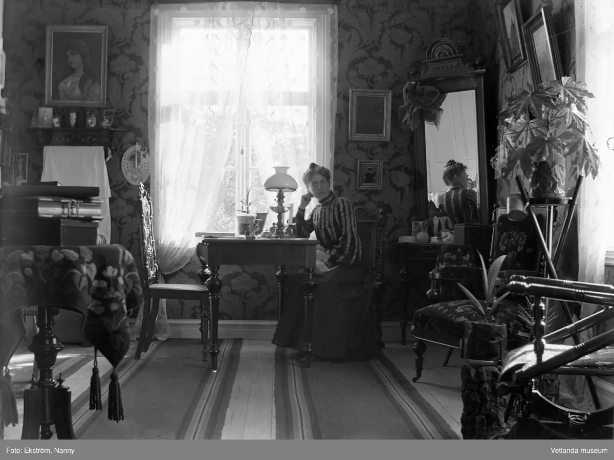 Fotografen Nanny Ekström vid ett bord, troligtvis i bostaden på Mogärde i Vetlanda.