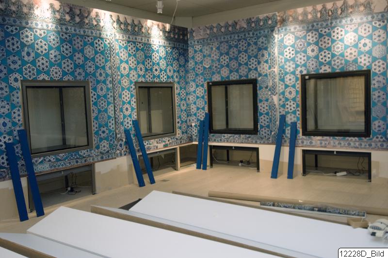 Medelhavsmuseet, interiör, Uppbyggnad av utställningen ”Blåvitt”.