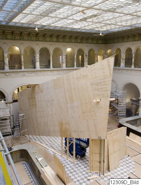 Uppbyggnad av den stora monoliten i centralhallen till den nya utställningen The A.G. Leventis Gallery of Cypriote Antiquities.