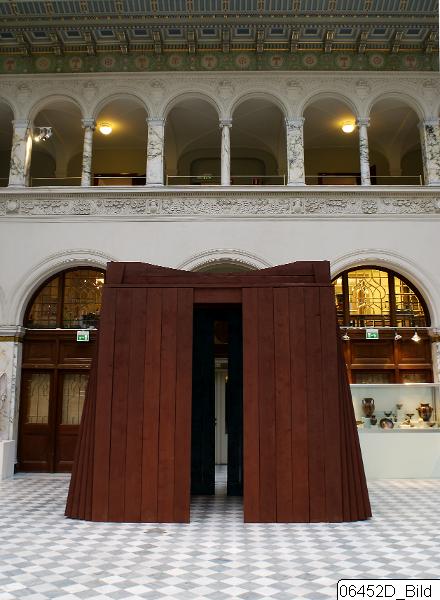 Beskrivning: Medelhavsmuseet, interiör. ”Design i Trä - under 5000 år” Kicki Bergqvist-Selders skulptur ”Vila”