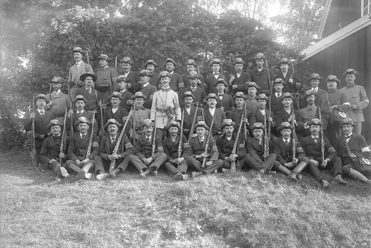 Enligt fotografens notering: "Gruppbild utomhus, Landstormen. Plutonchefen Regnell, Göteborg".