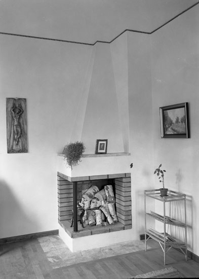 Uppgift enligt fotografen: "Interiör med öppen spis."