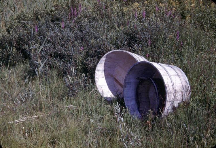 Tvättbaljor av trä vid strandkant