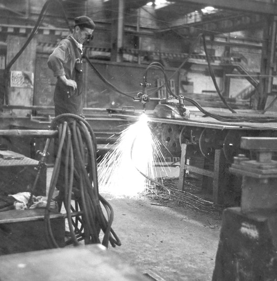 En varvsarbetare skär i plåt med skärbrännare
