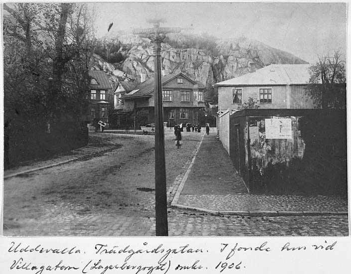 Text på kortet: "Uddevalla. Trädgårdsgatan i fonden hus vid Villagatan (Lagerbergsgatan) omkr. 1906".