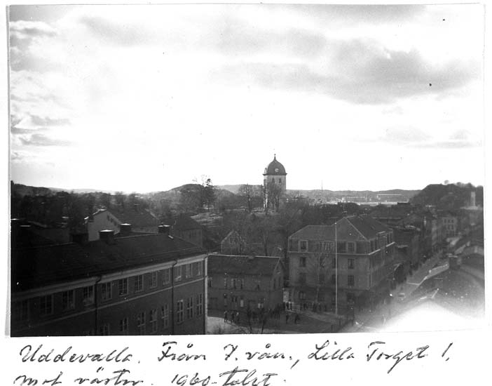 Text på kortet: "Uddevalla. Från 7. vån. Lilla Torget mot väster. 1960-talet".