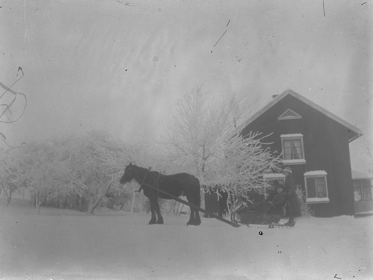 Enl. text i blå bok: "Häst och släde med personer framför hus."