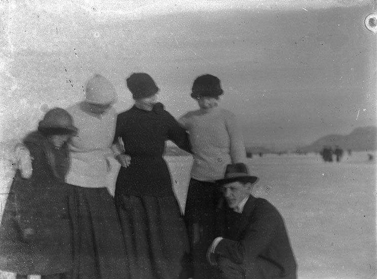 Enl. text i blå bok: "Fyra damer och en man (skridskor?)."