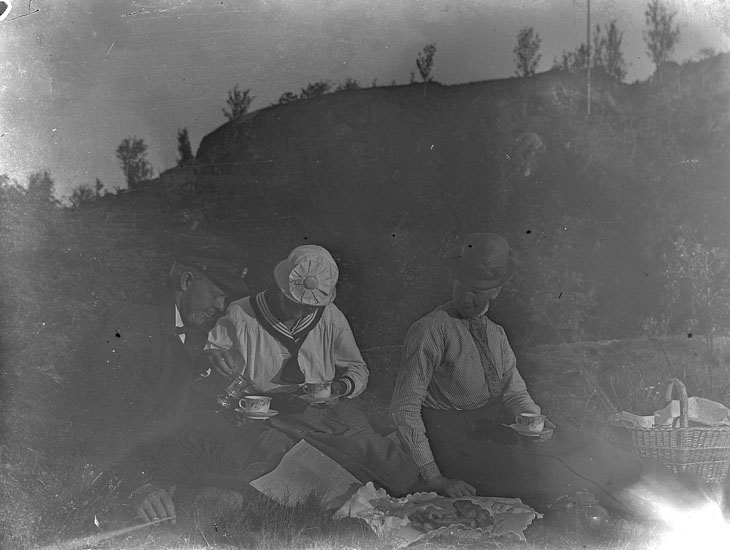 Enl. text i blå bok: "Två damer och en man med kaffekorg."