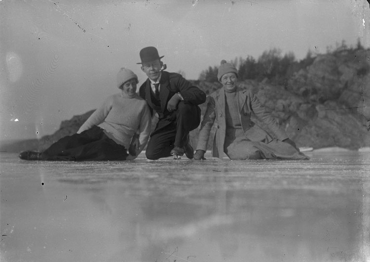 Enl. text i blå bok: "Tre skridskoåkare sittande på isen."