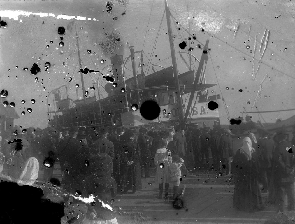 Text till bilden:"Ångfartyget Lovisa. Folk på kajen".
