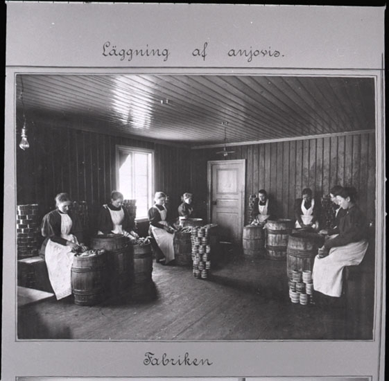 Text som medföljde bilden: "Norskkryddad ansjovis läggs in i kaggar 1898. Rensning av ansjovis."