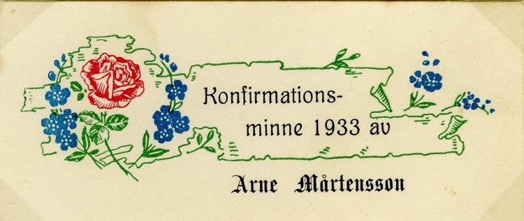 Text på kortet: Konfirmationsminne 1933 av Arne Mårtensson.