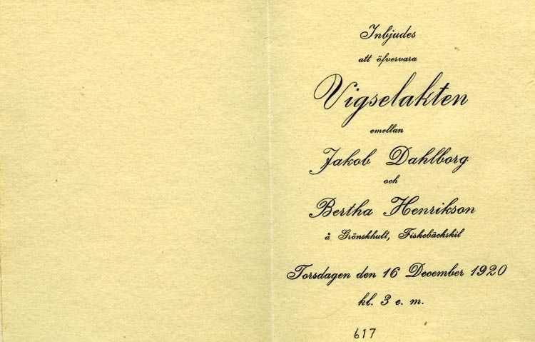Text på kortet: Inbjudes att öfvervara Vigselakten mellan Jacob Dahlborg och Bertha Henriksson å Grönskhult, Fiskebäckskil. Torsdagen den 16 December 1920 kl. 3 e.m.