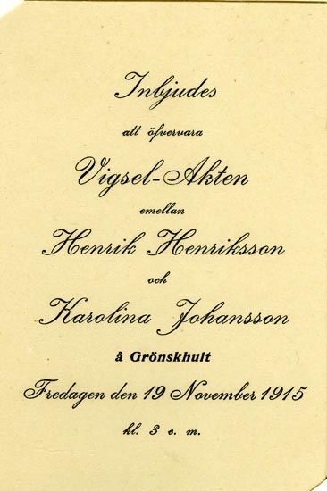 Text på kortet: Inbjudes att öfvervara Vigsel-Akten mellan Henrik Henriksson och Karolina Johansson å Grönskhult. Fredagen den 19 November 1915 kl.3 e.m.