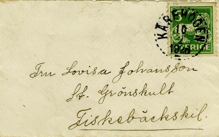Text på Kuvertet: Fru Lovisa Johansson St. Grönskult Fiskebäckskil.