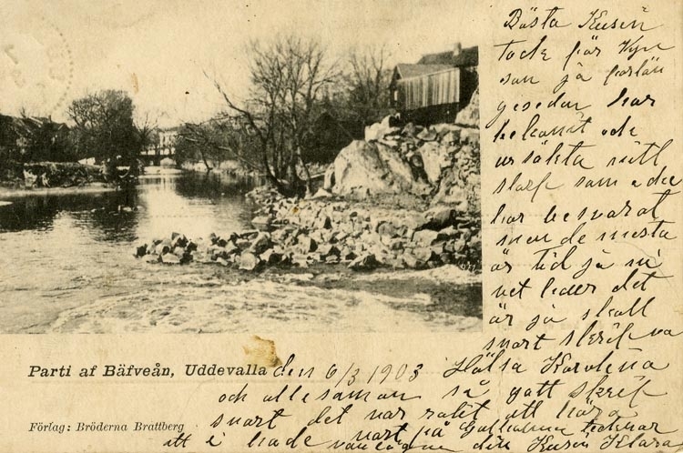 Notering på kortet: Parti af Bäfveån, Uddevalla.