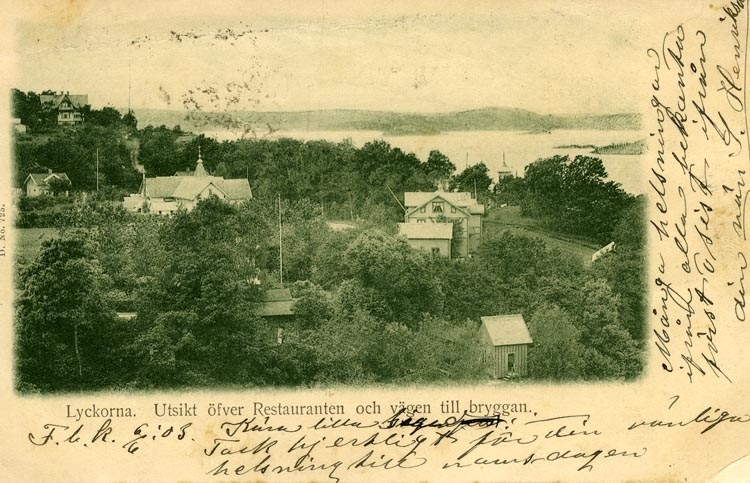 Notering på kortet: Lyckorna. Utsikt öfver Restauranten och vägen till bryggan.
