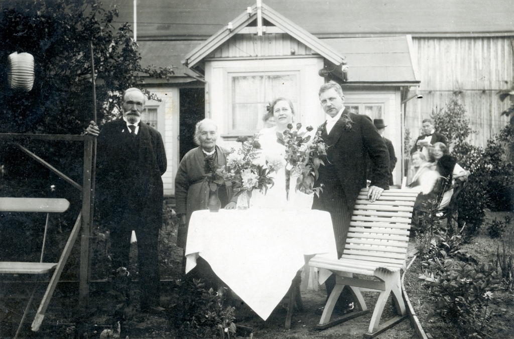 Alfred Träff och hans fästmö vid deras förlovningsfest. Paret står tillsammans med ett äldre par runt ett bord med buketter i en trädgård. Bakom dem synd ett hus och flera personer.