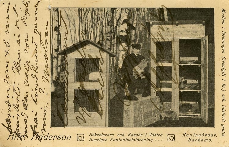 Enligt Bengt Lundins noteringar: "Alfr. Andersson. Sekreterare och kassör i Västra Sveriges Kaninafvelsförening. Kaningårdar, Backamo".