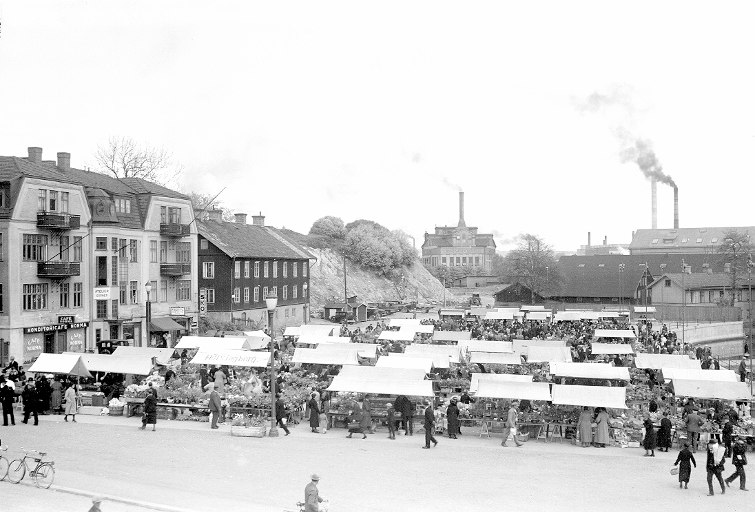 Krokshallstorget med torghandel omkring 1930. I fonden syns Wäveribolagets Ångpannecentral.