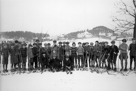 Elever vid Caroliskolan utövar skidåkning vid regementet. Lärare är Jean Rydberg.