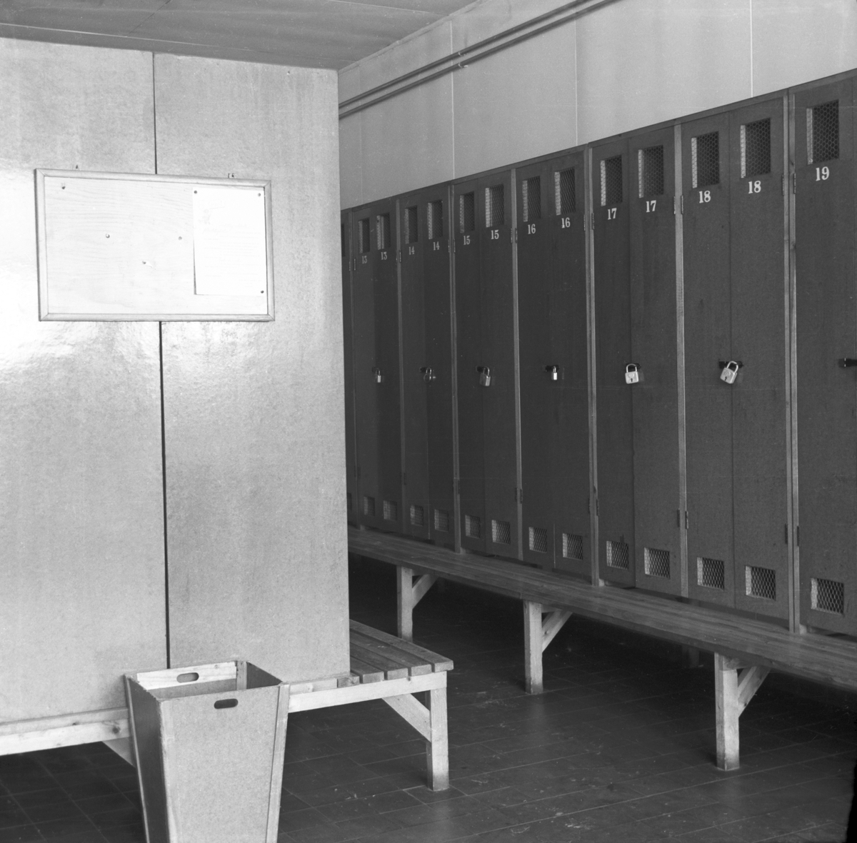 Omklädningsrum med numrerade plåtskåp låsta med hänglås.