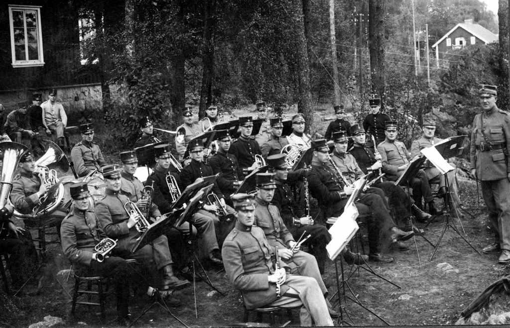 Kungliga Älvsborgs regemente på Fristad Hed, slutet av 1800-talet. Musikkåren spelar vid ett uppträdande.