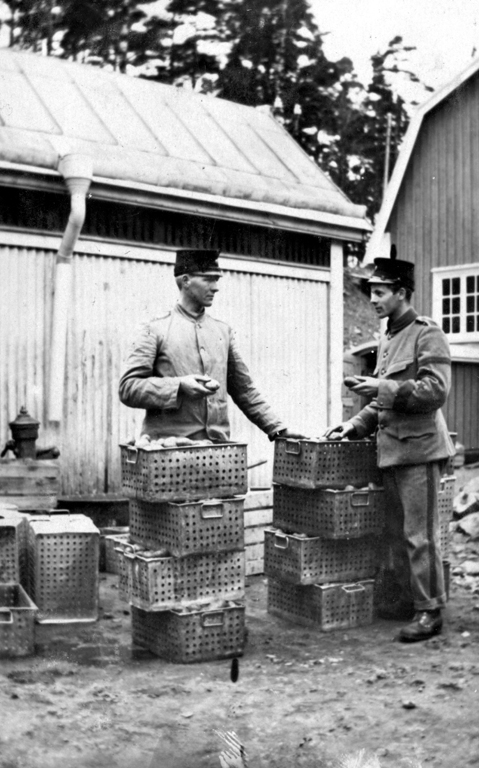 Kungliga Älvsborgs regemente på Fristad Hed, slutet av 1800-talet. Potatisskalning.
