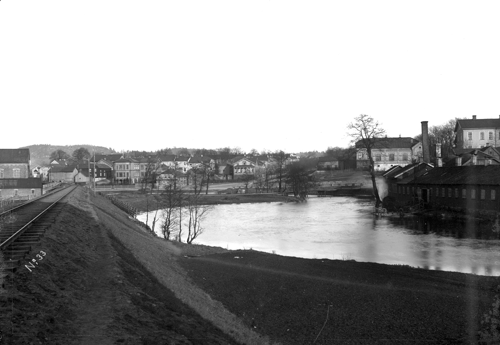 Okänd vy vid å, fabriker och järnvägsspår till vänster.
