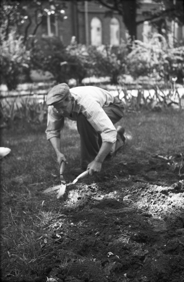 En trädgårdsmästare utför trädgårdsskötsel med sax/sekatör.