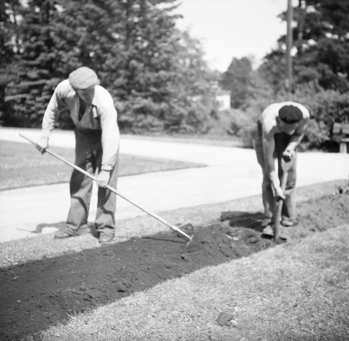 Två trädgårdsmästare utför trädgårdsskötsel i en rabatt.