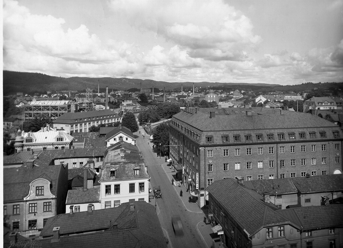 Vy från kvarteret Bachus med Österlånggatan och hotell Grand och skoaffären Oscaria år 1930.
