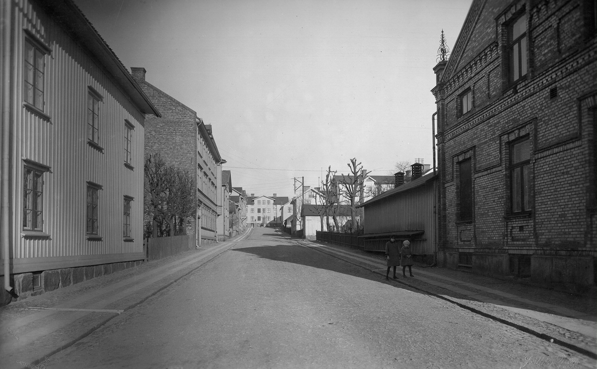 Berzeliigatan österut från Sturegatan med kvarteret Korsnäbben t.h. år 1928.