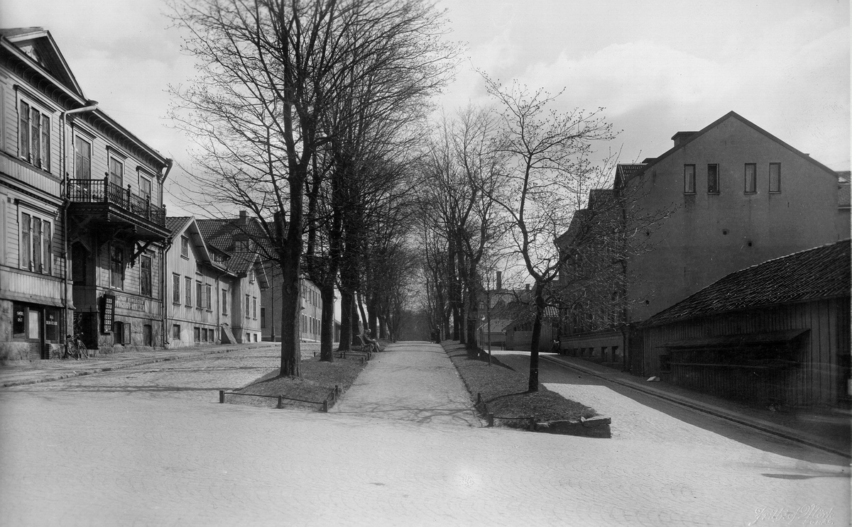 Allégatan söderut från Järnvägsgatan med kvarteret Balder t.v. år 1927.