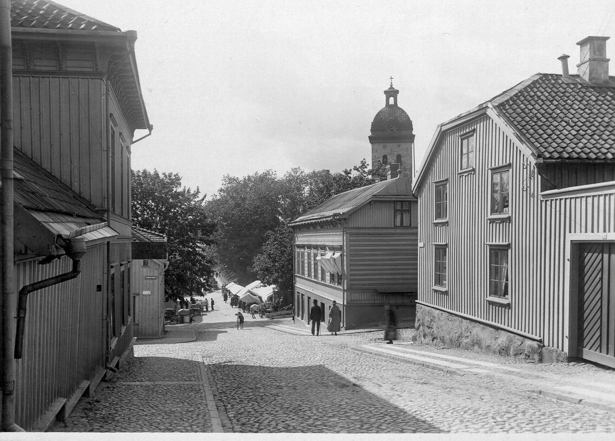 Södra Kyrkogatan, Sotarliden, västerut med kvarteret Heimdal t.h. och torghandel vid Hötorget år 1922.