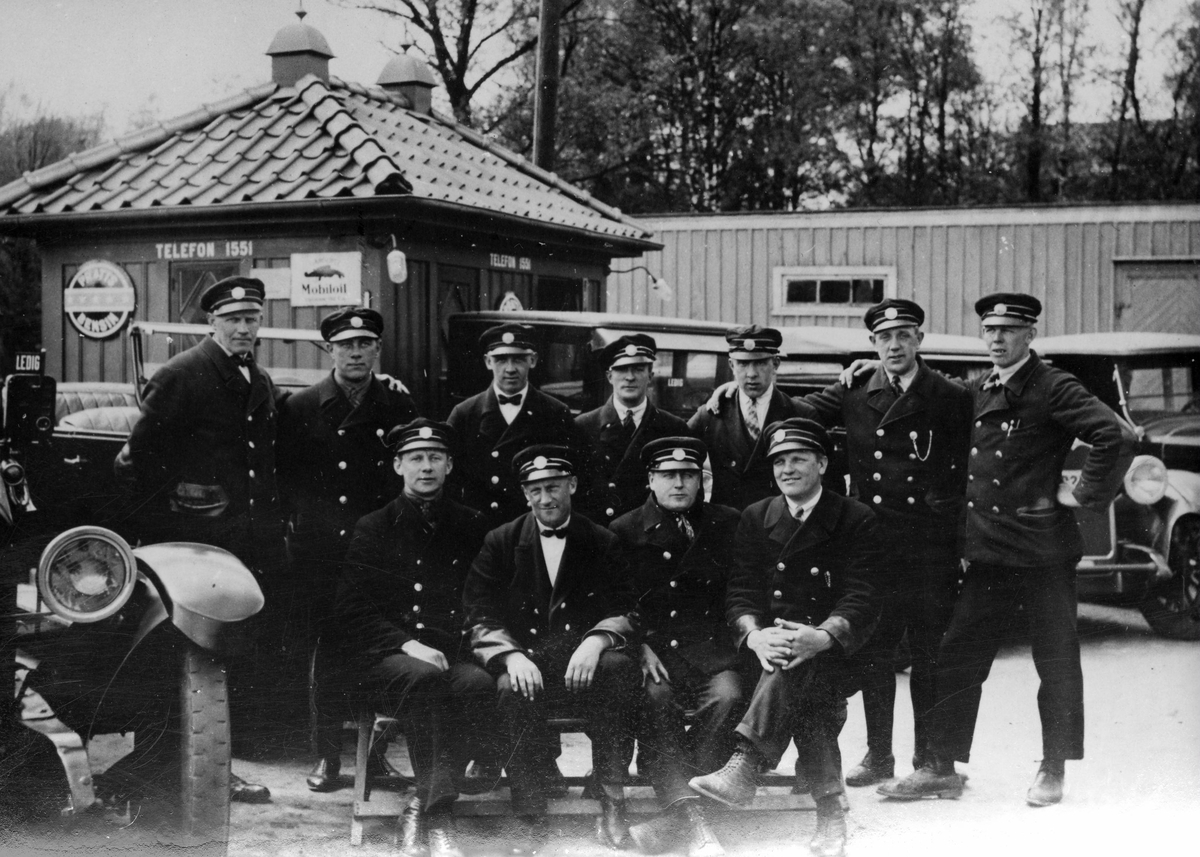 Chaufförer vid Borås Taxi, som var stationerat vid Teaterbron och som var verksamt mellan åren 1921 - 1931.