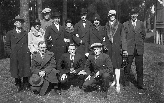 Gångtävling. Nils Ahlström knäsittande i mitten med Sixten "Målarn" Johansson stående längst till höger, samt publik.