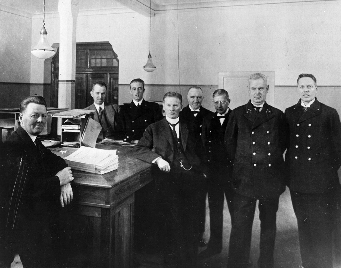 Personal vid tullkammaren 1931. Fr.v. Ivar Pehrson, Göran Lénberg, Åke Rosén, Martin Lagström, Jens Mattiasson, Helge Adelgren, Harald Nygren, Bengt Nordsjö.
