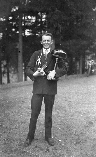Segraren i den första gångtävlingen 1929. Olof Armvik (Andersson) överlastad med priser, han vann på tiden 37.33.